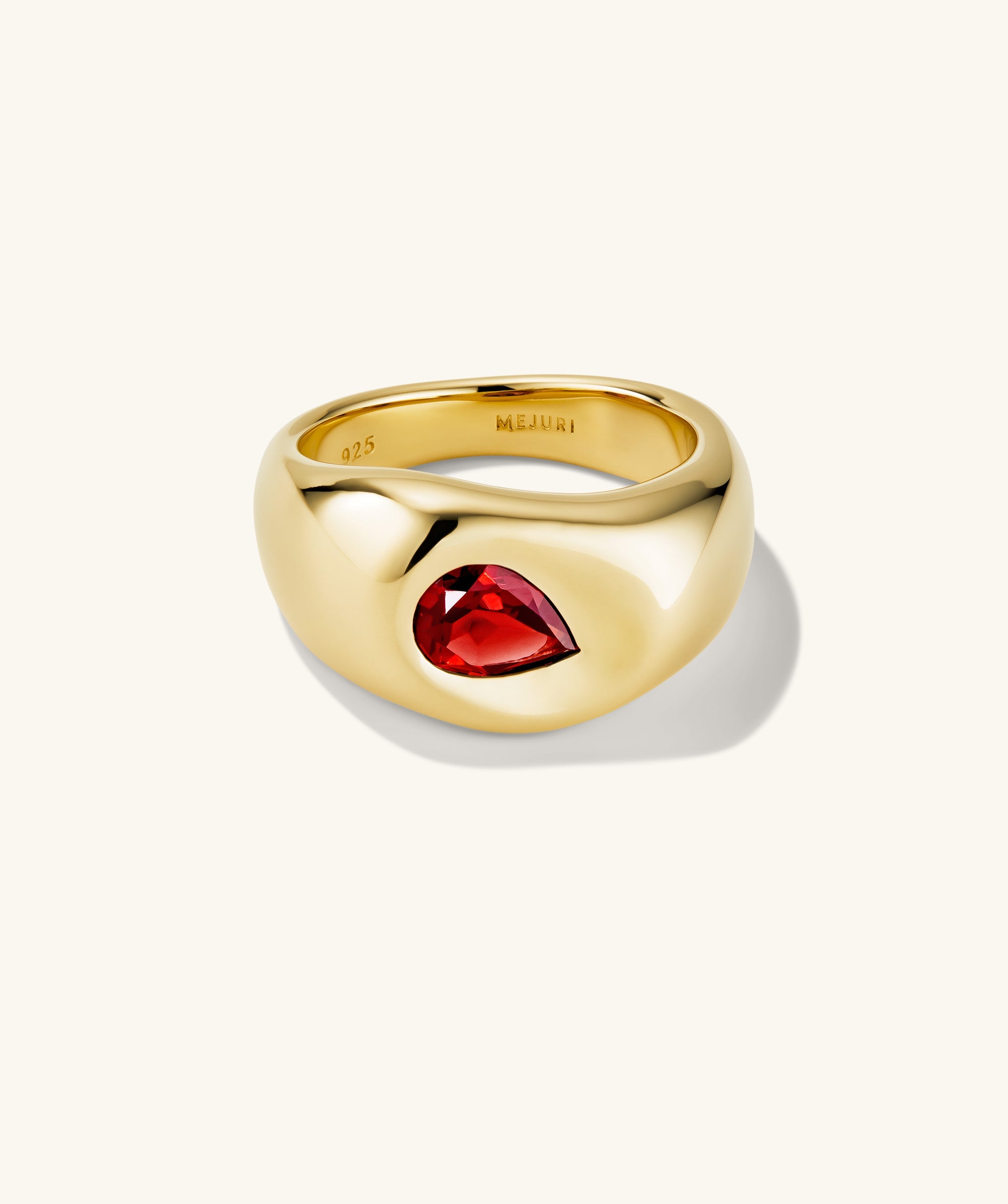 We reimagined our iconic Dôme silhouettes with this molten ring featuring a gemstone pressed into the surface. Sculptural, bold, and easy to wear on repeat.