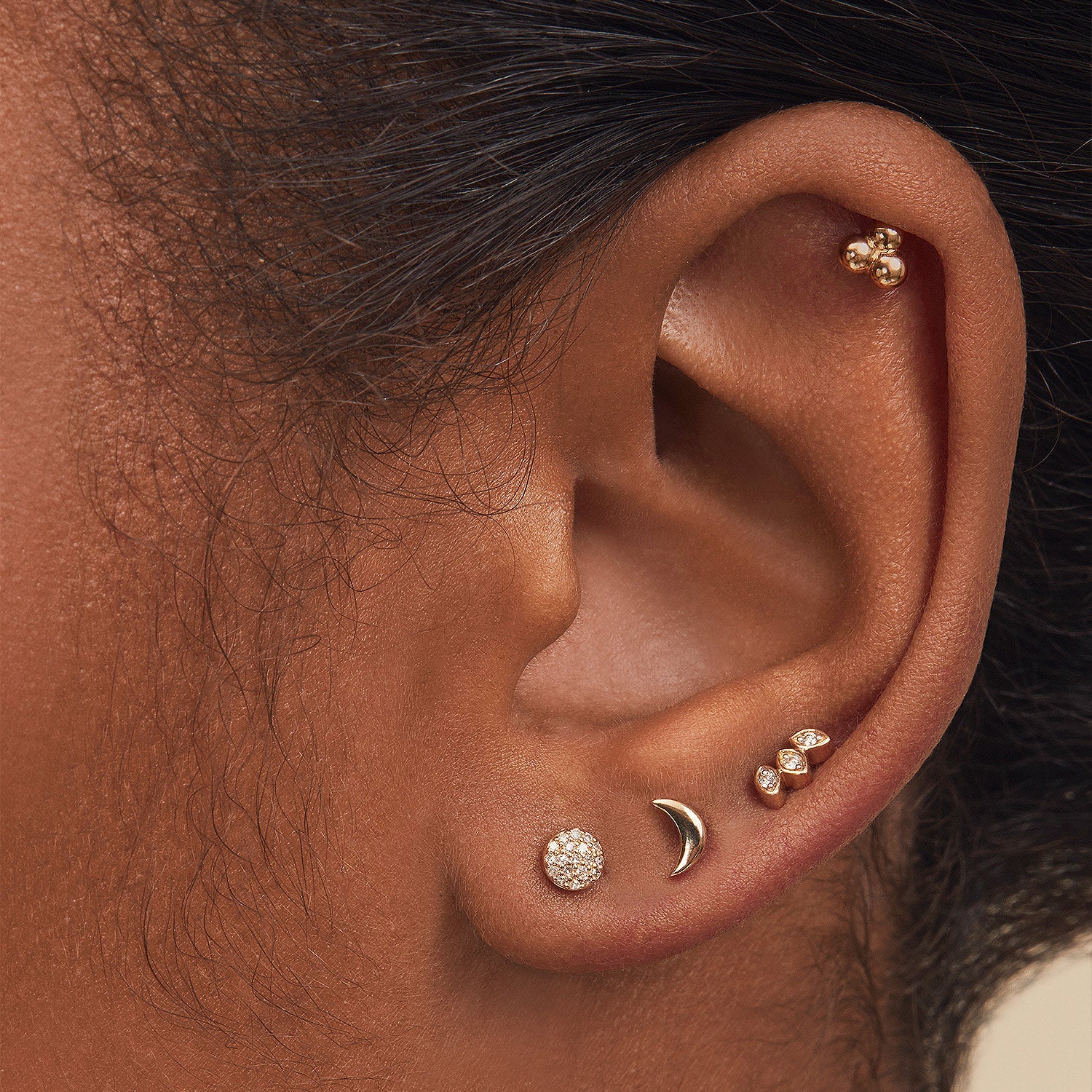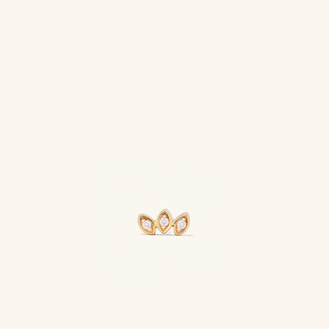 A statement stud made for showing off. Handcrafted in 14k solid gold and set with three marquise cut ethically sourced and conflict-free diamonds. Threadless flat back studs allow for maximum comfort and help to facilitate the healing process. The backing post is crafted using implant grade titanium that is safe for all metal sensitivities.